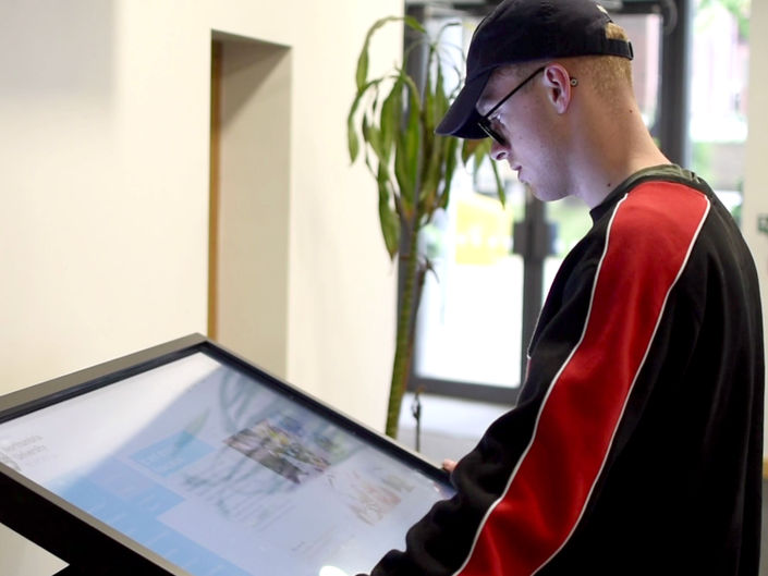 2020 - Touch interactive information kiosk and wayfinding for students, staff and visitors to access What's On, Campus information including cafes, restaurants, IT and library facilities.
